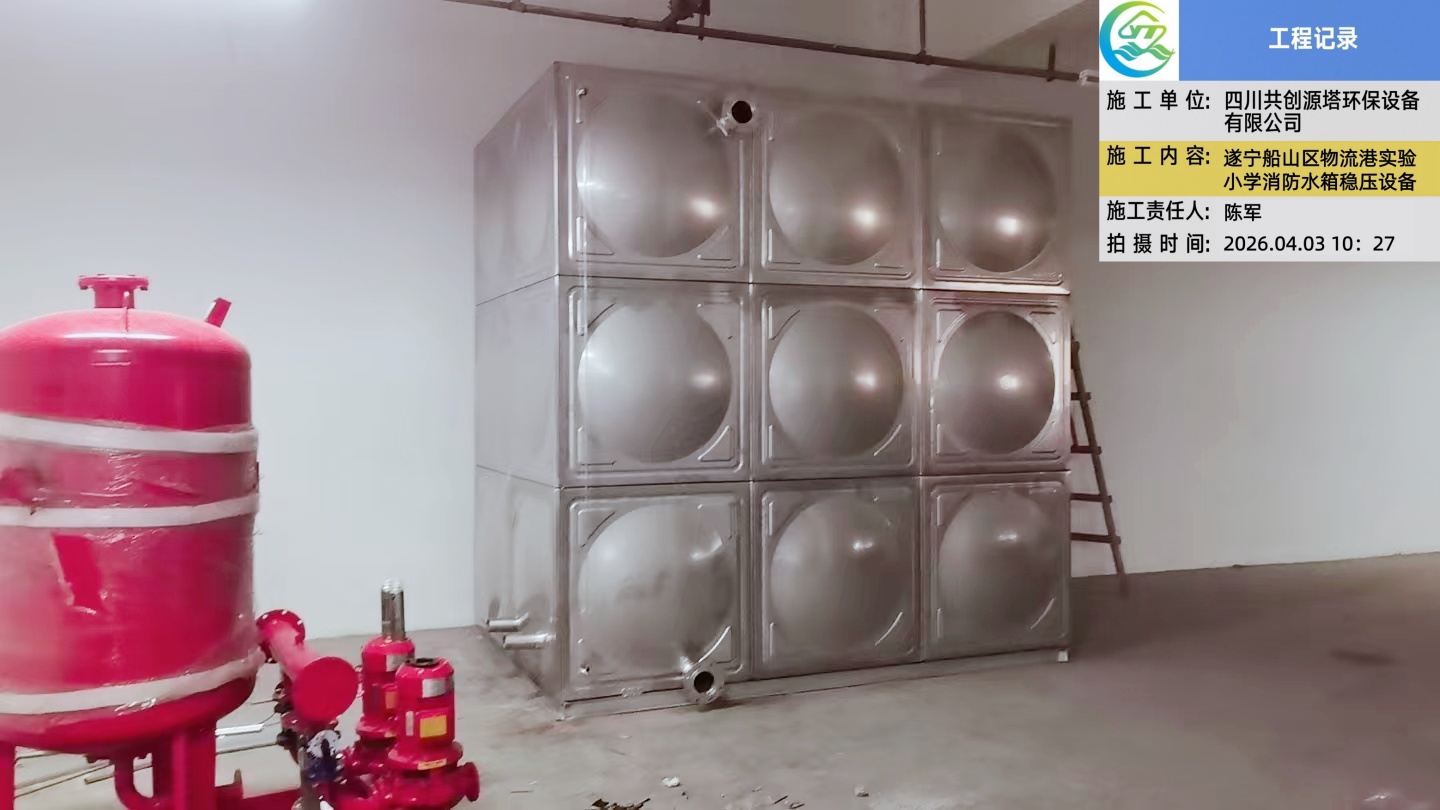 遂宁船山区物流港实验小学的消防水箱项目具有典型示范意义。该项目由四川共创源塔环保设备有限公司承接,交付了规格为3m×2m×3m的消防水箱及配套稳压设备。