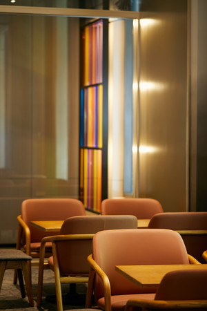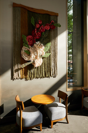 室内空间中央的中岛吧台,以重复性铜面圆管线条,呈现出多层次的华丽感,台面则以冷色调的大理石,加上金属色系来搭配;艺术墙面部分则是以真实的咖啡树枝,经过特殊处理后结合鲜艳的立体编织品,呈现出咖啡植栽的变化。